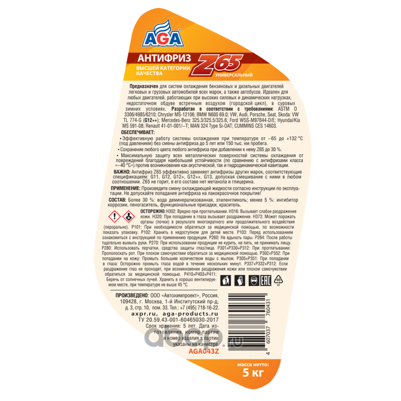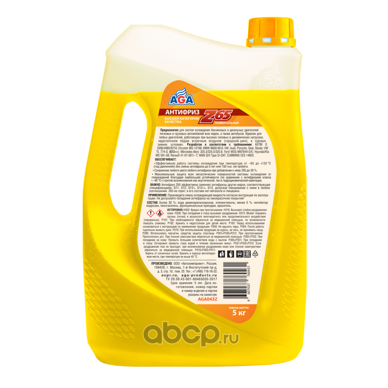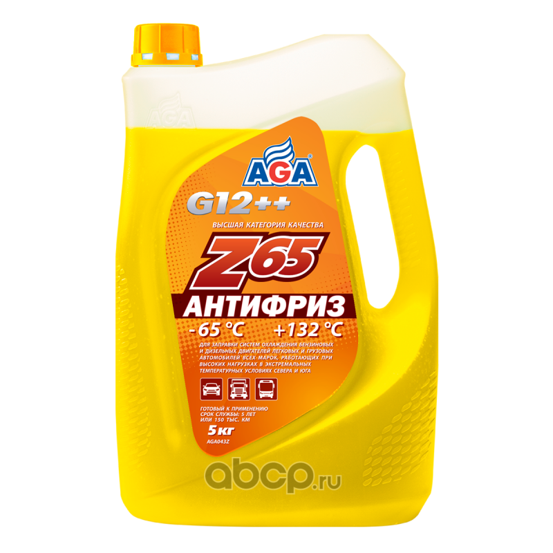 Антифриз AGA-Z65/G12++, 5 кгНазначениеУниверсальный антифриз. Предназначен для систем охлаждения бензиновых и дизельных двигателей легковых и грузовых автомобилей всех марок, а также автобусов. Идеален для любых двигателей, работающих в экстремальных условиях высоких силовых, скоростных и динамических нагрузок как в самых суровых зимних условиях, так и в жарких тропиках (даже при недостаточном обдуве встречным воздухом - городской цикл, трофи).СпецификацииРазработан в соответствии с требованиями: ASTM D 3306/4985/6210; Chrysler MS-12106; BMW N600 69.0; VW, Audi, Porsche, Seat, Skoda: VW TL 774-G (G12++); Mercedes-Benz 325.3/325.5/325.6; Ford WSS-M97B44-D/E; Hyundai/Kia MS 591-08; Renault 41-01-001/--T; MAN 324 Type Si-OAT; CUMMINS CES 14603СовместимостьДопускается смешивать в любом соотношении с антифризами класса –40 С других марок, соответствующими спецификациям: G11, G12, G12+, G12++, G13.Срок службы: до 5 лет, или 150 000 км пробега.Рабочий температурный диапазон: от –65 до +132 C.Воспламеняемость: Не горит, в составе нет метанола и глицерина.Технологическая основа производства антифриза: Адаптивная Z-технология.Индивидуальные отличительные свойстваПри добавлении до 30 % антифриза Z65 (желтый) к другим антифризам красного, зеленого, синего и любого иного цвета не изменяет их изначальный цвет. Красный останется красным, зеленый – зеленым и т. д.Превосходит все без исключения антифризы класса –40 С по устойчивости против возникновения как акустической, так и гидродинамической кавитации (образования газовых пузырьков, разрушающих металл при схлопывании). Это обеспечивает максимальную защиту всех внутренних металлических поверхностей системы охлаждения от механических повреждений, вызываемых кавитацией (например, не будет раковин в каналах головки блока цилиндров, ""мокрые"" гильзы цилиндров никогда не получат сквозных раковин и т. д.).Антифриз AGA-Z65 отличается очень низким давлением насыщенных паров (всего 60 кПа при 100 С), при котором кавитация в системе охлаждения автомобильных двигателей уже не возникает. При добавлении 0,22 л дистиллированной воды на 1 л антифриза AGA-Z65 получится антифриз с температурой начала кристаллизации –40 С. Срок службы (5 лет) при этом сохранится.СОСТАВ: Более 30 %: вода деминерализованная, этиленгликоль; менее 5 %: ингибитор коррозии, пеногаситель, функциональные присадки, краситель.