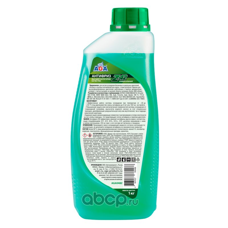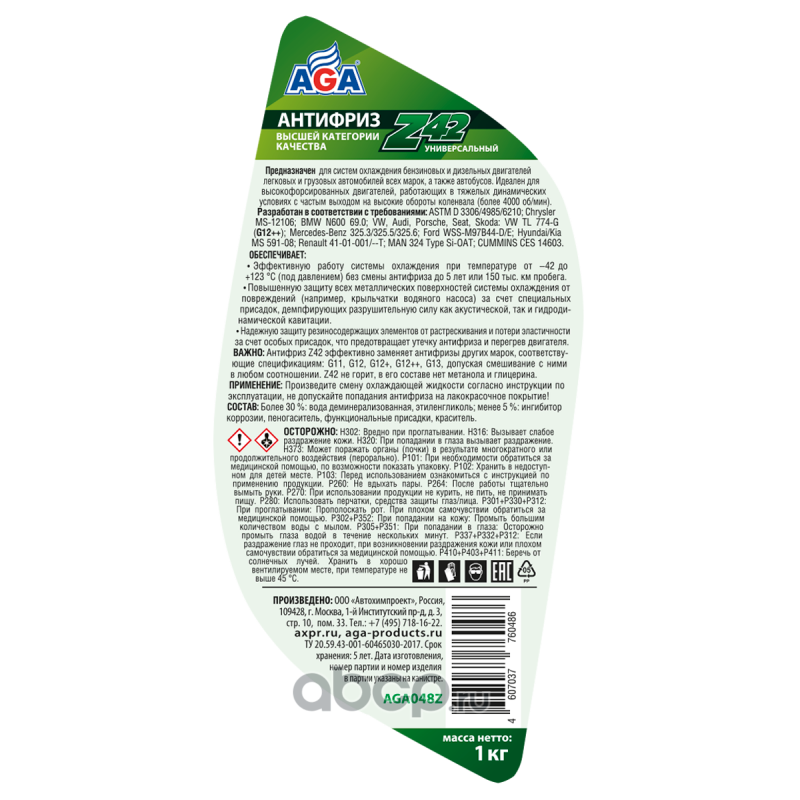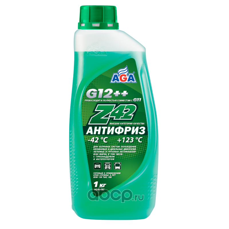 Антифриз AGA-Z42/G12++, 1 кг Назначение: Универсальный антифриз. Предназначен для систем охлаждения бензиновых и дизельных двигателей легковых и грузовых автомобилей всех марок, а также автобусов. Идеален для высокофорсированных двигателей, работающих в тяжелых динамических условиях с частым выходом на высокие обороты коленчатого вала, например, более 4000 об/мин (спортивный стиль вождения, ралли, интенсивный городской цикл).Спецификации: Разработан в соответствии с требованиями: ASTM D 3306/4985/6210; Chrysler MS-12106; BMW N600 69.0; VW, Audi, Porsche, Seat, Skoda: VW TL 774-G (G12++); Mercedes-Benz 325.3/325.5/325.6; Ford WSS-M97B44-D/E; Hyundai/Kia MS 591-08; Renault 41-01-001/--T; MAN 324 Type Si-OAT; CUMMINS CES 14603Совместимость: Допускается смешивать в любом соотношении с антифризами других марок, соответствующими спецификациям: G11, G12, G12+, G12++, G13. Срок службы: до 5 лет, или 150 000 км пробега. Рабочий температурный диапазон: от –42 до +123 °C.Воспламеняемость: Не горит, в составе нет метанола и глицерина. Технологическая основа производства антифриза: Адаптивная Z-технология. Индивидуальные отличительные свойства: Обеспечивает особую (повышенную) защиту всех металлических поверхностей системы охлаждения от кавитации. Антифриз содержит специальные присадки, которые ""прилипают"" к металлическим поверхностям и демпфируют разрушительную силу ударной волны, возникающей вследствие схлопывания газовых пузырьков в антифризе при акустической и гидродинамической кавитации. Надежно защищает все резиносодержащие элементы системы охлаждения от растрескивания и набухания, что предотвращает выход двигателя из строя вследствие утечки антифриза из-за разрушения резиновых патрубков и шлангов. Специальные присадки осаждаются на внутренней поверхности резиносодержащих элементов и поддерживают их эластичность, защищая от старения и растрескивания. Увеличение оборотов коленвала вызыввает повышение интенсивности циркуляции охлаждающей жидкости и, соответственно, скорости ее течения по каналам системы охлаждения. Это условие способствует возникновению разрушительного физического явления – кавитации. Антифриз AGA-Z42 обладает самым высоким потенциалом антикавитационной защиты благодаря применению специальных присадок.СОСТАВ: Более 30 %: вода деминерализованная, этиленгликоль; менее 5 %: ингибитор коррозии, пеногаситель, функциональные присадки, краситель.