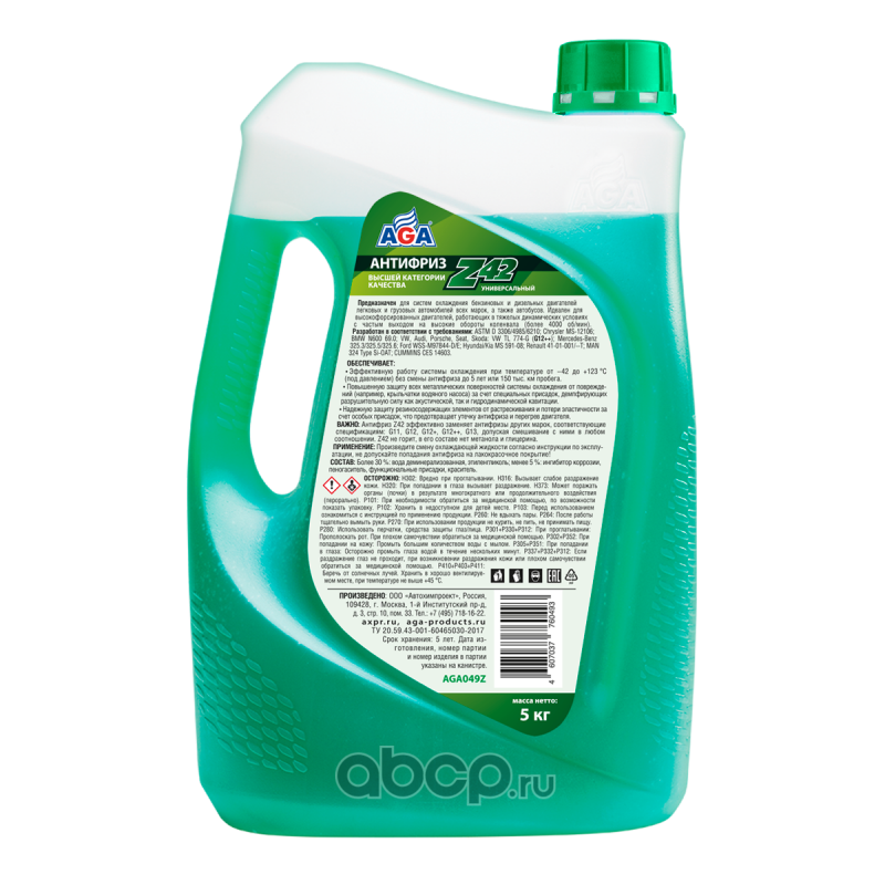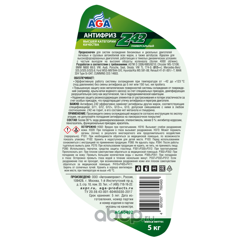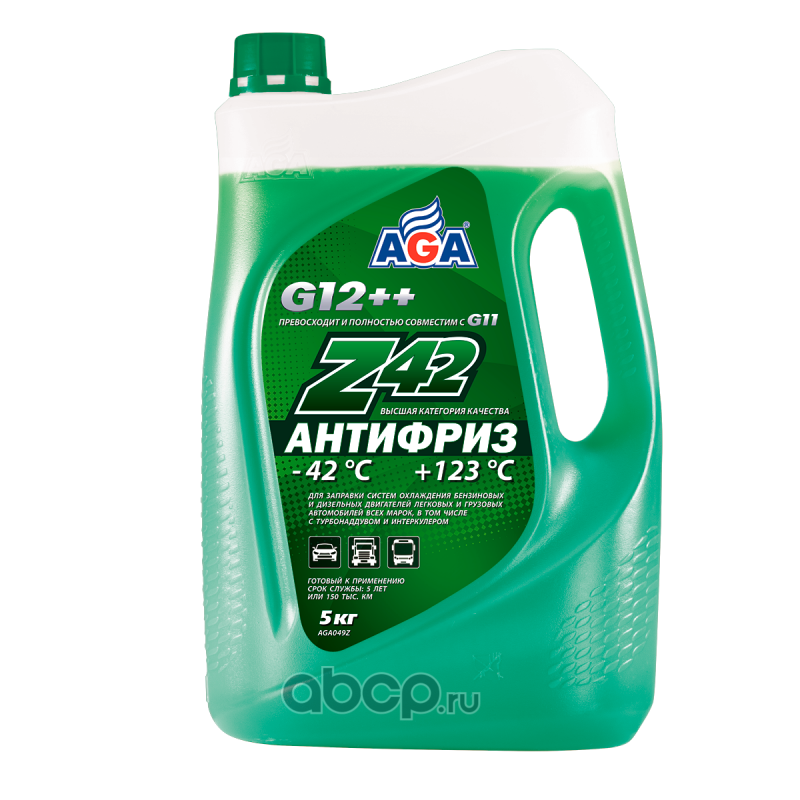 Антифриз AGA-Z42/G12++, 5 кг Назначение: Универсальный антифриз. Предназначен для систем охлаждения бензиновых и дизельных двигателей легковых и грузовых автомобилей всех марок, а также автобусов. Идеален для высокофорсированных двигателей, работающих в тяжелых динамических условиях с частым выходом на высокие обороты коленчатого вала, например, более 4000 об/мин (спортивный стиль вождения, ралли, интенсивный городской цикл). Спецификации: Разработан в соответствии с требованиями: ASTM D 3306/4985/6210; Chrysler MS-12106; BMW N600 69.0; VW, Audi, Porsche, Seat, Skoda: VW TL 774-G (G12++); Mercedes-Benz 325.3/325.5/325.6; Ford WSS-M97B44-D/E; Hyundai/Kia MS 591-08; Renault 41-01-001/--T; MAN 324 Type Si-OAT; CUMMINS CES 14603 Совместимость: Допускается смешивать в любом соотношении с антифризами других марок, соответствующими спецификациям: G11, G12, G12+, G12++, G13. Срок службы: до 5 лет, или 150 000 км пробега. Рабочий температурный диапазон: от –42 до +123 C. Воспламеняемость: не горит, в составе нет метанола и глицерина. Технологическая основа производства антифриза: адаптивная Z-технология. Индивидуальные отличительные свойства: Обеспечивает особую (повышенную) защиту всех металлических поверхностей системы охлаждения от кавитации. Антифриз содержит специальные присадки, которые ""прилипают"" к металлическим поверхностям и демпфируют разрушительную силу ударной волны, возникающей вследствие схлопывания газовых пузырьков в антифризе при акустической и гидродинамической кавитации. Надежно защищает все резиносодержащие элементы системы охлаждения от растрескивания и набухания, что предотвращает выход двигателя из строя вследствие утечки антифриза из-за разрушения резиновых патрубков и шлангов. Специальные присадки осаждаются на внутренней поверхности резиносодержащих элементов и поддерживают их эластичность, защищая от старения и растрескивания. Увеличение оборотов коленвала вызывает повышение интенсивности циркуляции охлаждающей жидкости и, соответственно, скорости ее течения по каналам системы охлаждения. Это условие способствует возникновению разрушительного физического явления – кавитации. Антифриз AGA-Z42 обладает самым высоким потенциалом антикавитационной защиты благодаря применению специальных присадок.ПРИМЕНЕНИЕ: Произведите смену охлаждающей жидкости согласно инструкции по эксплуатации, не допускайте попадания антифриза на лакокрасочное покрытие! СОСТАВ: Более 30 %: вода деминерализованная, этиленгликоль; менее 5 %: ингибитор коррозии, пеногаситель, функциональные присадки, краситель.