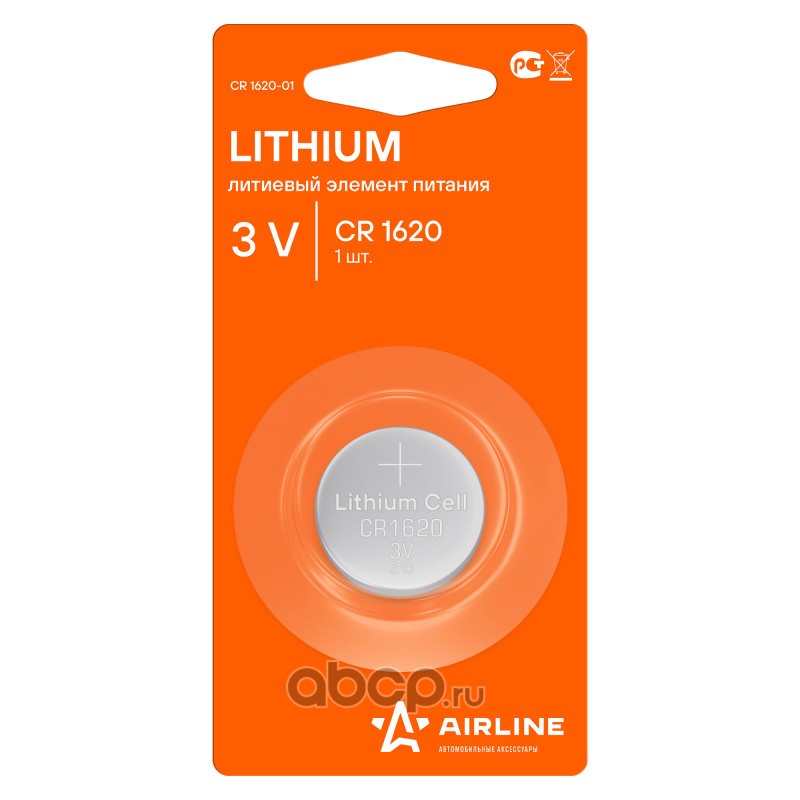 Батарейка литиевая AIRLINE Lithium CR1620 3V (1 шт) CR1620-01