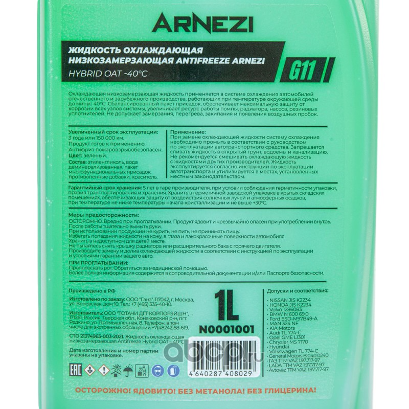 Расширенное описание: Антифриз ARNEZI Green G11 1 л