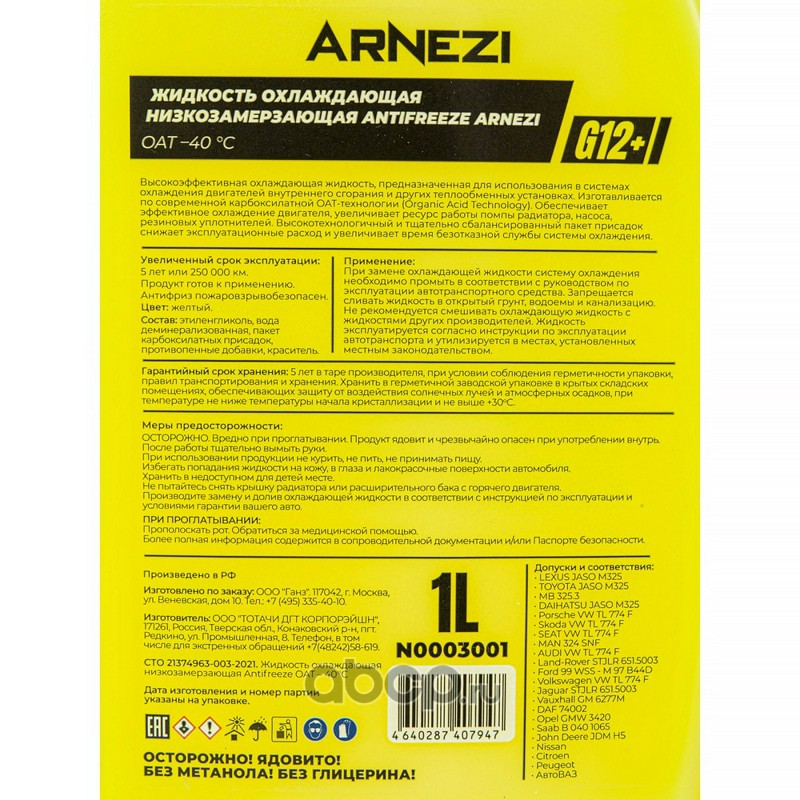 Антифриз ARNEZI Yellow G12+ 1 л