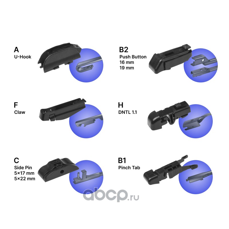 bayonet (штыковой замок), j-hook (крючок), pinch tab (боковой зажим), push button (кнопка) 19мм, side pin (боковой штырь) 22мм, top lock (верхний замок)