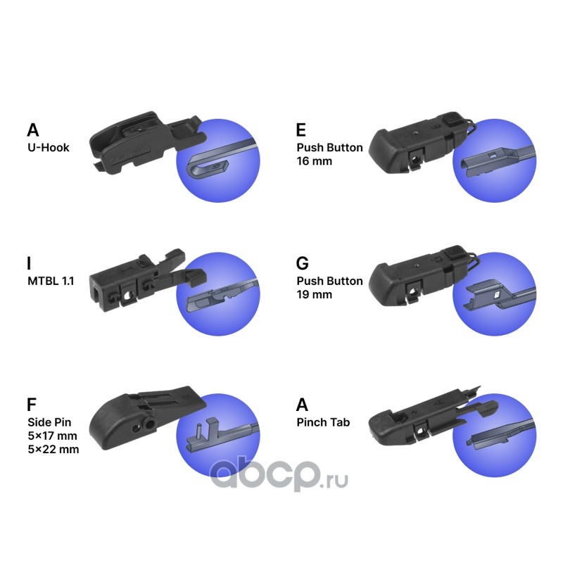 bayonet (штыковой замок), j-hook (крючок), pinch tab (боковой зажим), push button (кнопка) 19мм, side pin (боковой штырь) 22мм, top lock (верхний замок)