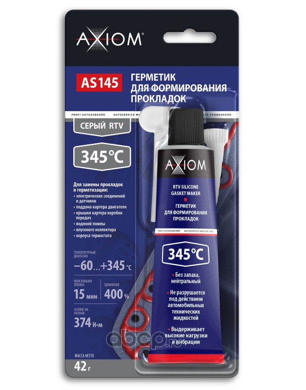 Высокотемпературный однокомпонентный автомобильный силиконовый герметик AXIOM® AS145 применяется для формирования или ремонта прокладок в узлах автомобиля, подверженных воздействию высоких температур, таких как поддон картера и коробки передач, водяной насос, крышка газораспределительного механизма, корпус термостата и других. Способен заменить прокладки, сальники, а также бумажные, резиновые, металлические и другие уплотнители. Не содержит растворителей и кислот, не вызывает коррозии, может применяться для герметизации электрических соединений и датчиков. Вулканизирующийся при комнатной температуре RTV-силикон образует прочную, эластичную прокладку (удлинение до разрыва 500%). Обладает повышенной адгезией к поверхностям из стали, чугуна, алюминия. Стоек к воздействию технических жидкостей автомобиля (смазочных материалов, охлаждающих жидкостей, растворов кислот и щёлочей). Заполняет полости и зазоры до 7 мм. Отверждённый герметик может эксплуатироваться в температурном диапазоне от –60°C до +345°C (кратковременно). Вулканизируется при комнатной температуре. Температурный диапазон эксплуатации от –60°С до +345°С. Без запаха, на нейтральной основе. Не содержит растворителей и кислот, не вызывает коррозии. Заполняет полости и зазоры до 7 мм. Не разрушается под действием автомобильных технических жидкостей (масел, антифриза, тормозной жидкости и т.п.). Выдерживает высокие нагрузки и вибрации. Для замены прокладок и герметизации: электрических соединений и датчиков, поддона картера двигателя, крышки картера коробки передач, водяной помпы, впускного коллектора, корпуса термостата.