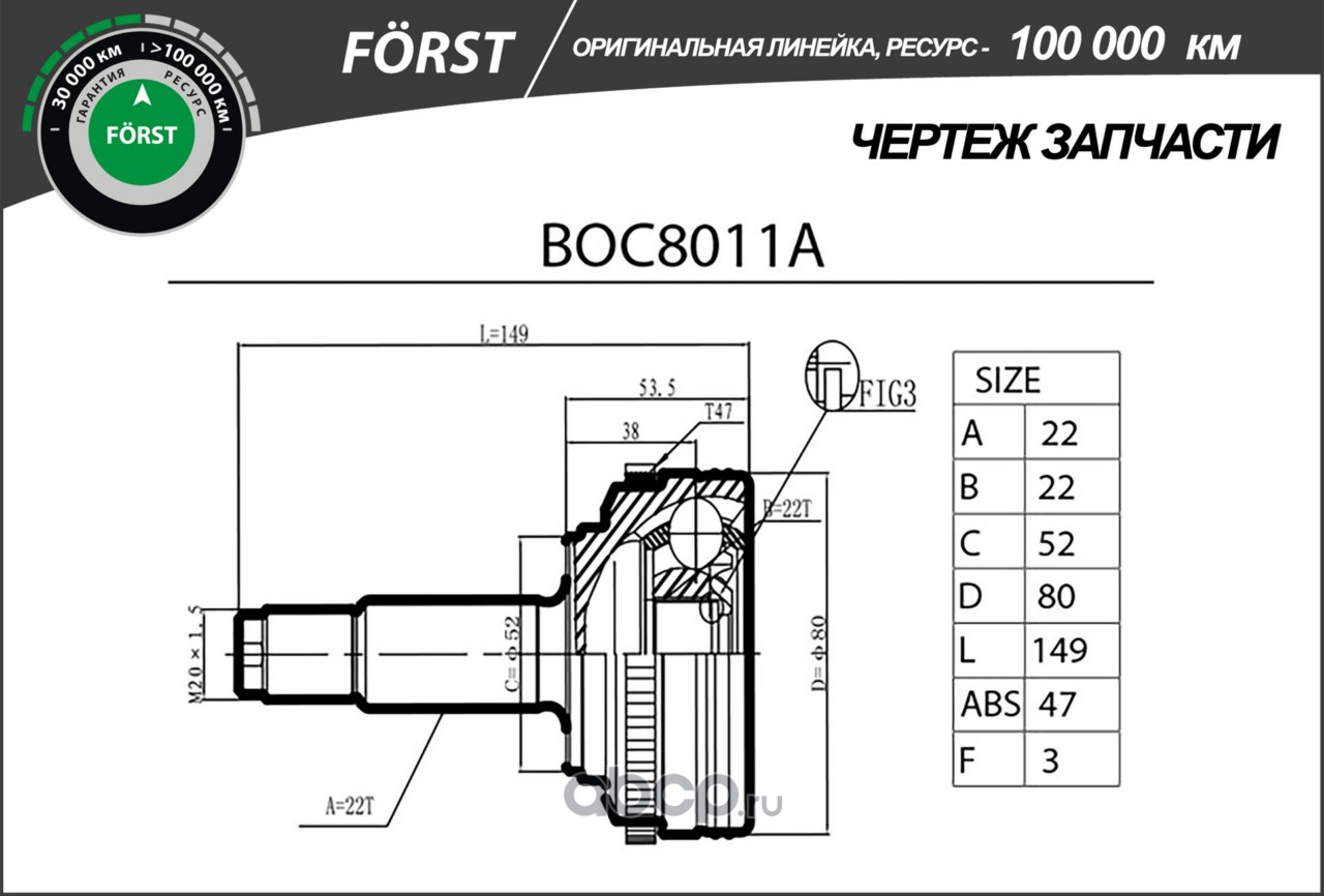 Шрус CHEVROLET Aveo (02-), DAEWOO Kalos (02-) (наруж.) [с ABS, 22/22]