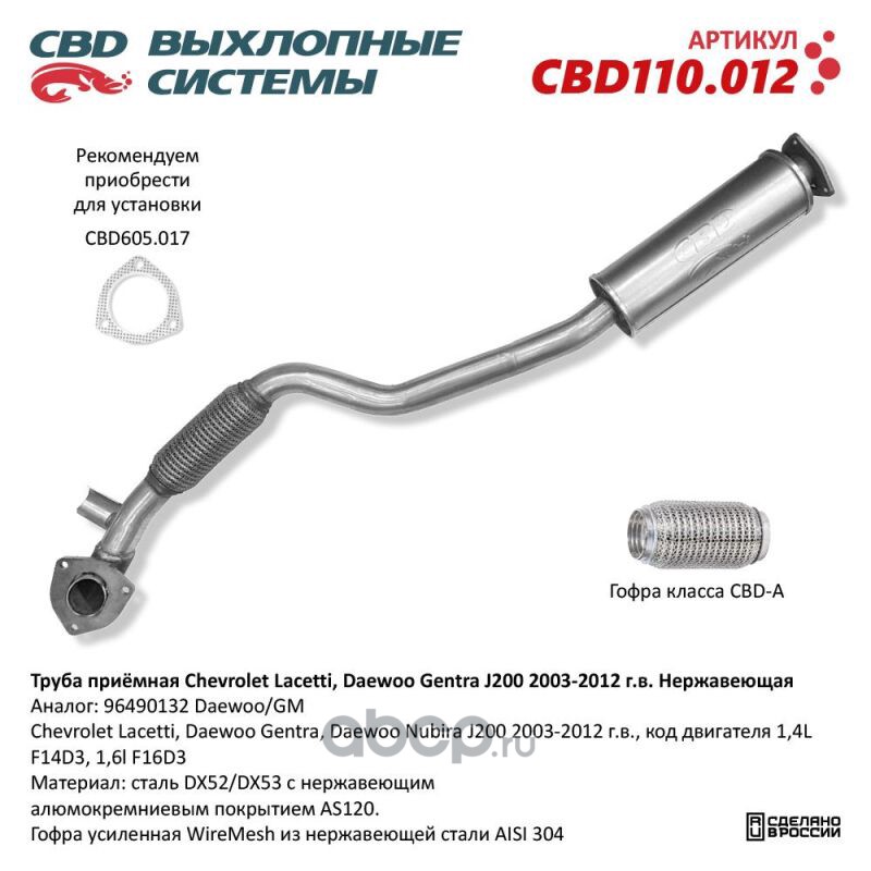 Труба приёмная Chevrolet Lacetti, Daewoo Gentra J200 2003-2012 г.в. Нержавеющая. CBD110.012