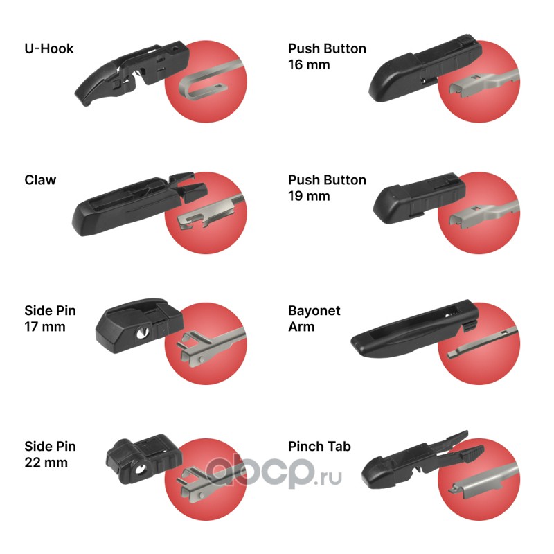claw (клешня), j-hook (крючок), pinch tab (боковой зажим), push button (кнопка) 19мм, side mounting (боковое крепление), side pin (боковой штырь) 17мм, side pin (боковой штырь) 22мм