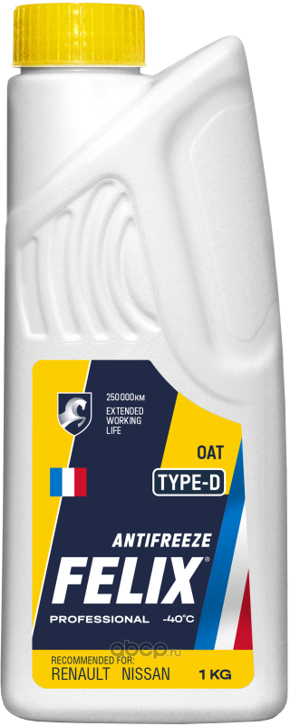 Профессиональный карбоксилатный антифриз (тип OAT). Разработан в соответствии с требованиями технической спецификации RENAULT STANDARD 41-01-001/--T. Предназначен для использования в любых современных системах охлаждения двигателей при температуре окружающего воздуха до минус 40°С и адаптирована для использования в автомобилях RENAULT. Представляет собой смесевую композицию на основе водного раствора этиленгликоля, воды и карбоксилатного пакета стабилизирующих и антикоррозионных присадок, содержащих противопенные и красящие добавки. Обладает увеличенным сроком эксплуатации – 250 000 км пробега или 5 лет использования (без смешивания с другими типами охлаждающих жидкостей). Цвет: желтый. Готовый к применению. Рекомендован для автомобилей: Renault, Nissan (на платформе В0), Citroen, Peugeot