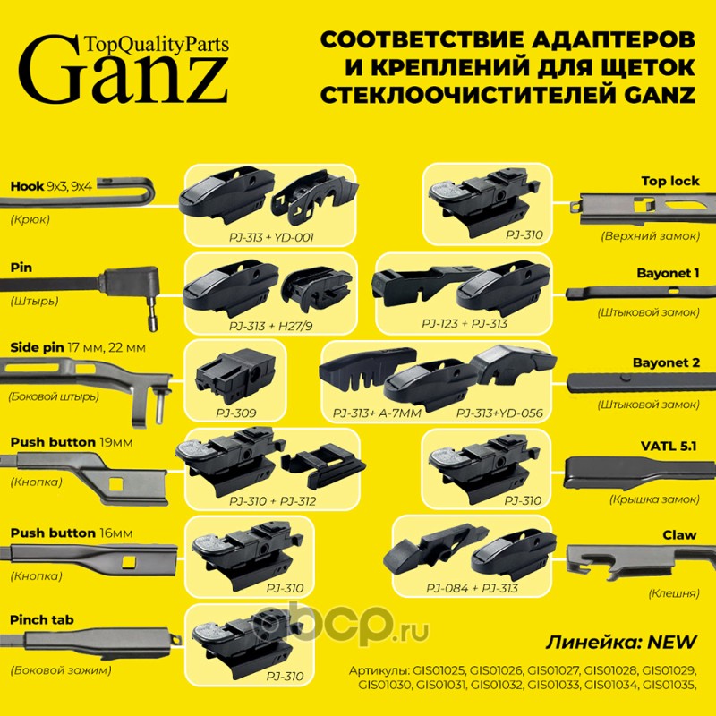 bayonet (штыковой замок), claw (клешня), j-hook (крючок), pinch tab (боковой зажим), pin lock (штырь), push button (кнопка) 19мм, side pin (боковой штырь) 22мм, top lock (верхний замок)