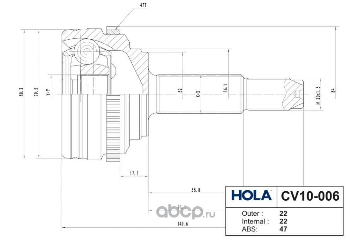 CV10-006, HOLA, ШРУС, наружный, левый/правый, 22/22 шл., CHEVROLET Lanos, Aveo (T200,T250,T255); ZAZ Lanos, Vida, (1шт.)