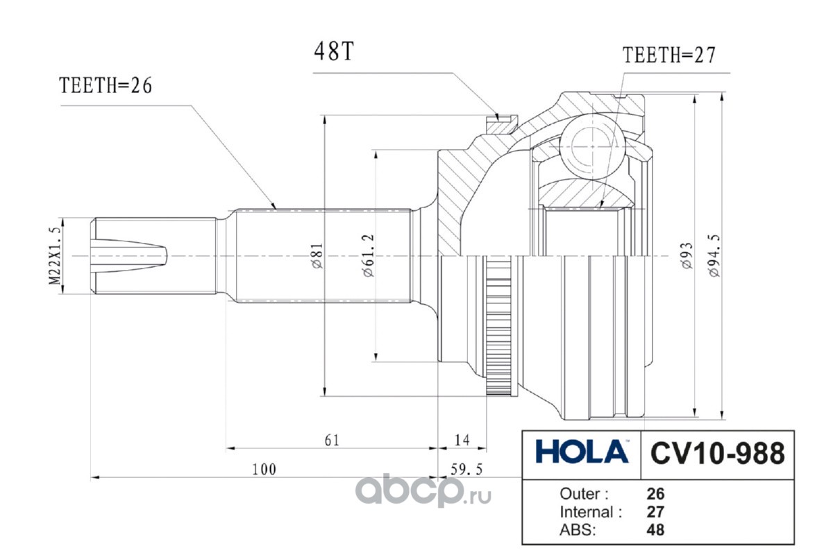 CV10-988, HOLA, ШРУС, наружный, левый/правый, 26/27 шл., TOYOTA Camry (V50) 2.5 AT; LEXUS ES200, ES250 (V60), (1шт.)