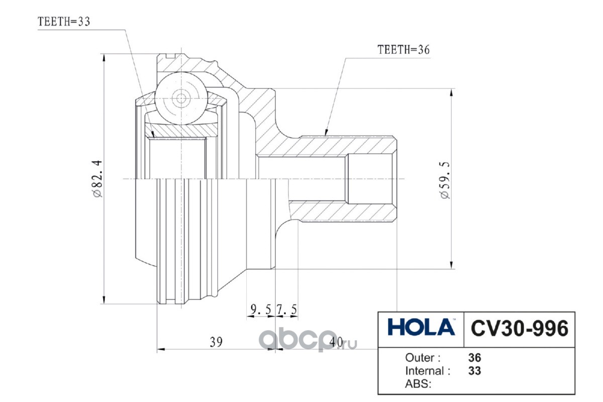 CV30-996, HOLA, ШРУС, наружный, задняя ось, левый/правый, 36/33 шл., VW Tiguan (5N) 4motion, Golf VI 2.0 R 4motion; SKODA Octavia (1Z5) 4x4, Yeti (5L) 4x4; AUDI A3 (8P) S3 quattro, Q3 quattro; SEAT Al