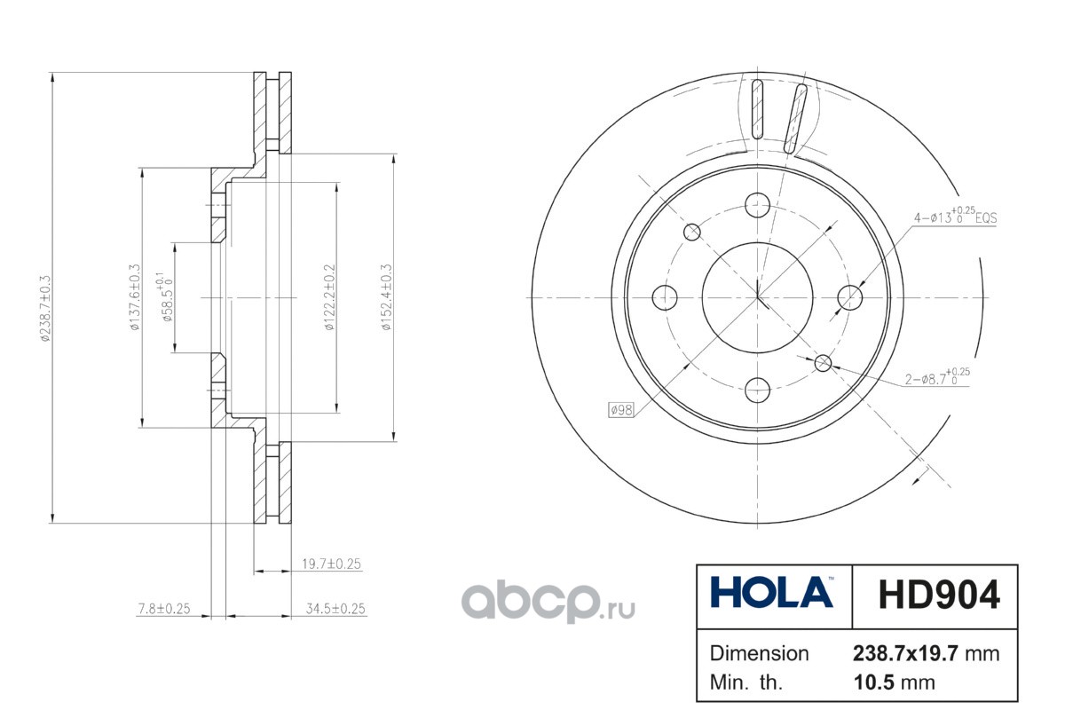 HD904, HOLA, Тормозной диск, вентилируемый, передний, 13", LADA 2110-12, Kalina (1117-19), Priora (2170-72), (1шт)