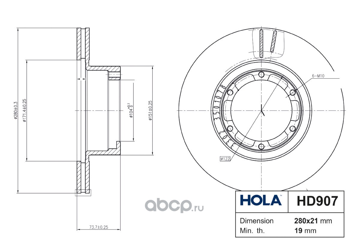 HD907, HOLA, Тормозной диск, вентилируемый, передний, GAZ Gazelle 2705-3302, (1шт)