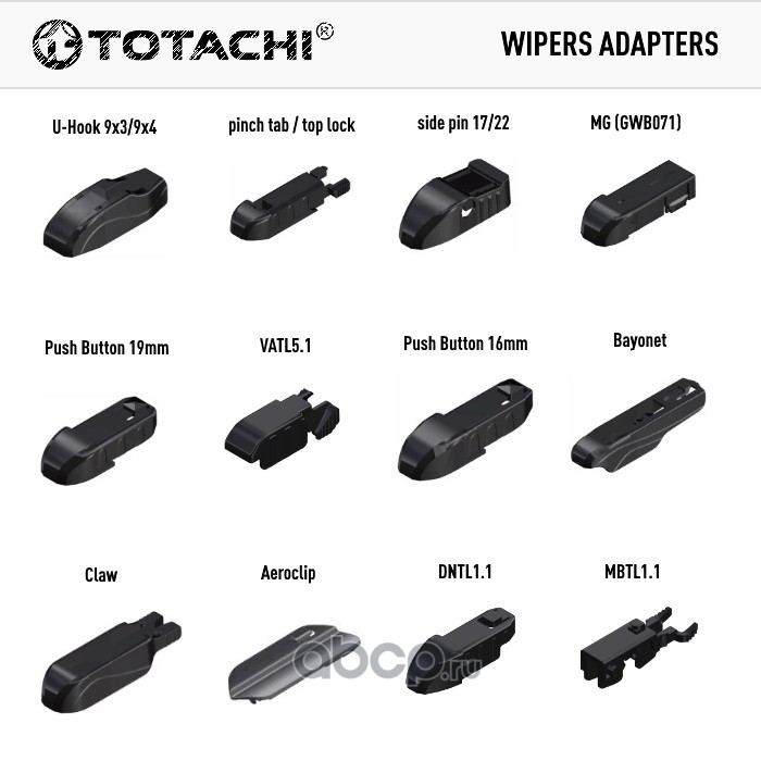 AeroClip (АэроКлип), GWB044 (DNTL1.1), GWB045 (MBTL1.1), GWB046 (VATL5.1), GWB071, bayonet (штыковой замок), claw (клешня), j-hook (крючок), narrow push putton (узкая кнопка) 16мм, pinch tab (боковой зажим), push button (кнопка) 19мм, top lock (верхний замок)