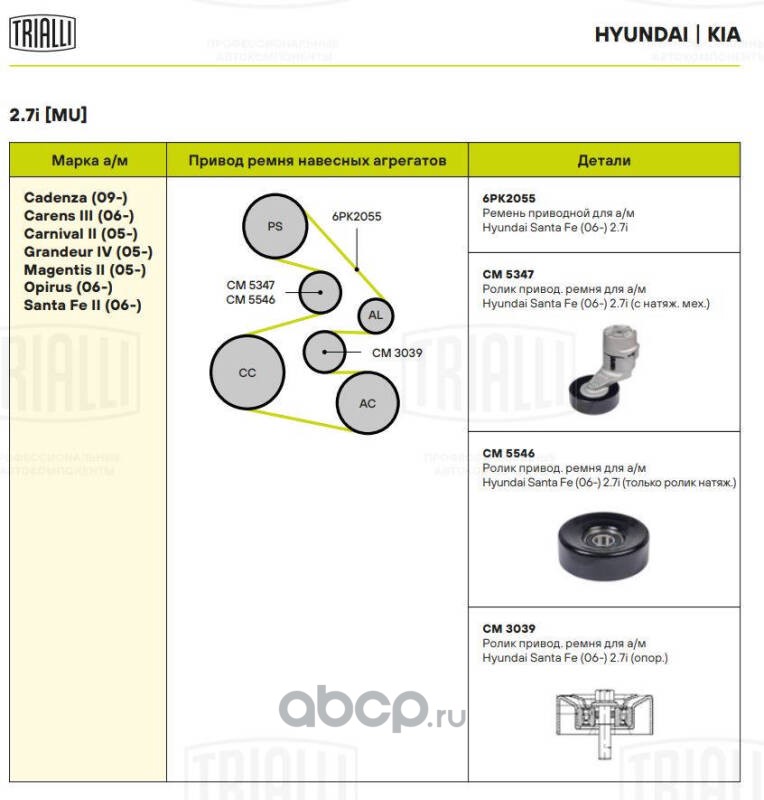 Ролик приводного ремня для автомобилей Hyundai Santa Fe (06-) 2.7i (только ролик натяжителя)