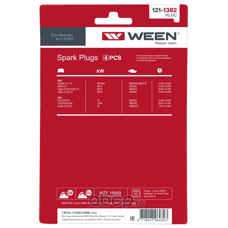 121-1382, WEEN, Свечи зажигания, дв. ZMZ 402, GAZ Gazelle, Sobol, Volga, (Компл. 4 шт.)