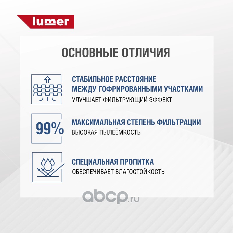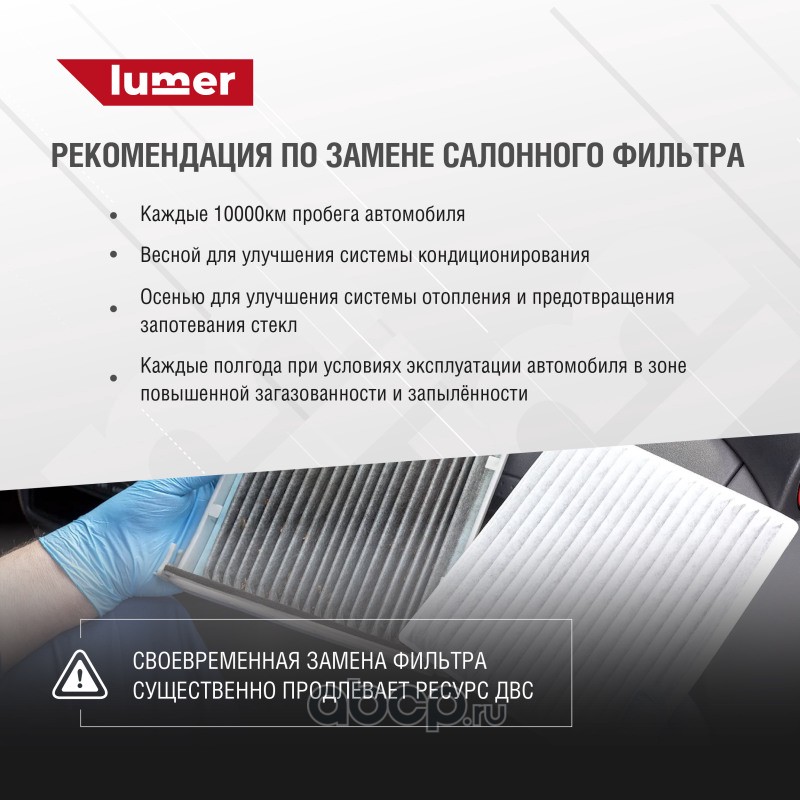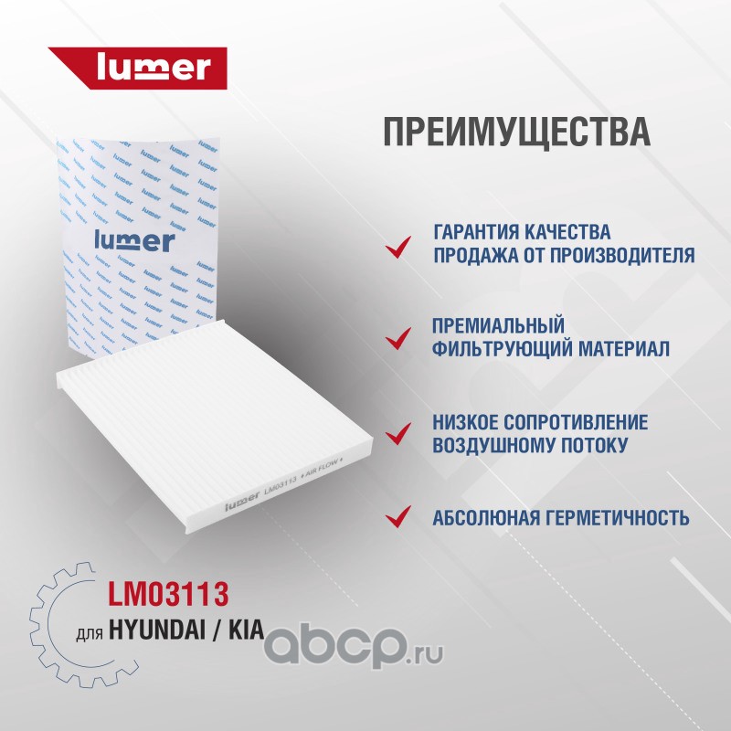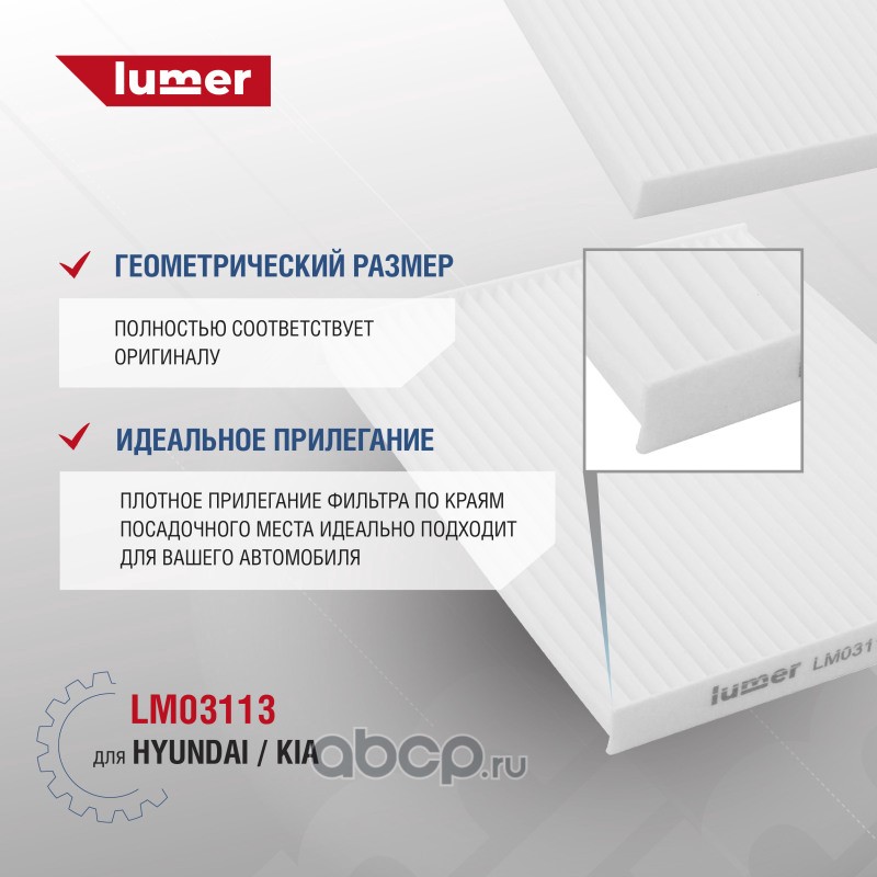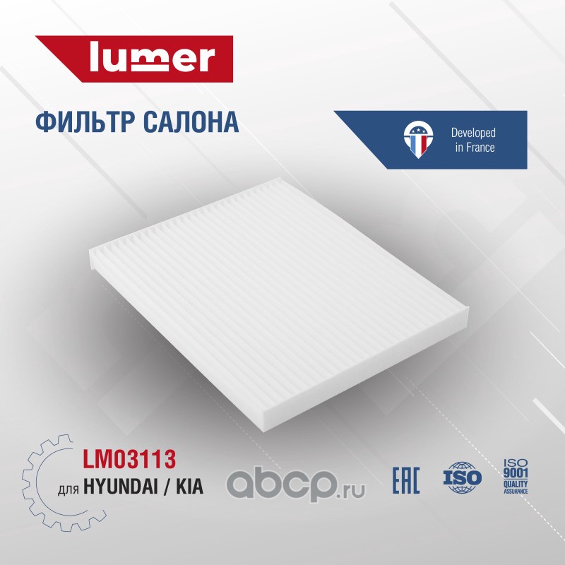 Фильтр салона HYUNDAI | KIA. Применяется для фильтрации воздуха, поступающего в салон автомобиля. Сохраняет воздух в салоне автомобиля чистым, не пропуская внутрь вредные вещества, газы и пыль. Фильтр салона LUMER LM03113 произведён на высокоточном оборудовании с полностью автоматизированной сборкой, 100% контроль качества каждой операции, полное соответствие оригиналам по посадочным местам и размерам и беспроблемной установке на автомобиль. Купить фильтр воздушный LUMER - лучшее решение для Вашего автомобиля.