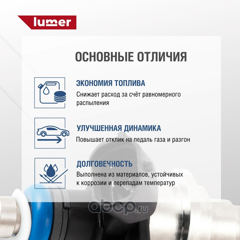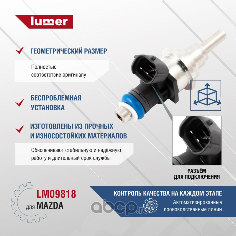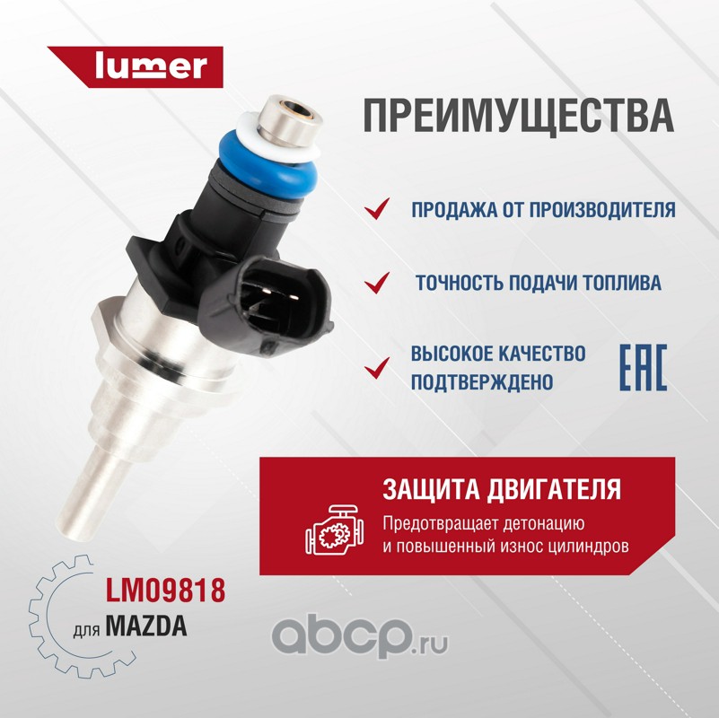 Форсунка топливная MAZDA. Форсунка (другое название — инжектор), являясь конструктивным элементом системы впрыска, предназначена для дозированной подачи топлива, его распыления в камере сгорания (впускном коллекторе) и образования топливно-воздушной смеси. Форсунка используется в системах впрыска как бензиновых, так и дизельных двигателей. Форсунка топливная LUMER LM09818 произведена на высокоточном оборудовании с полностью автоматизированной сборкой, 100% контроль качества каждой операции, полное соответствие оригиналам по посадочным местам и размерам и беспроблемной установке на автомобиль. Использование в производстве высоко качественных составов и материалов гарантирует надежность и долговечность. Купить форсунку двигателя LUMER - лучшее решение для Вашего автомобиля.